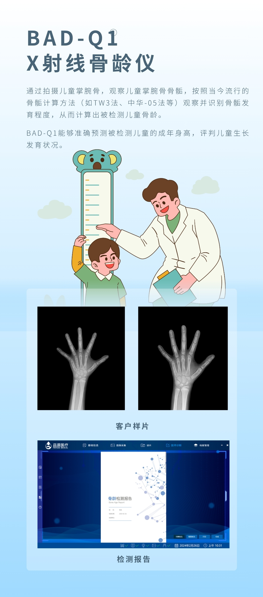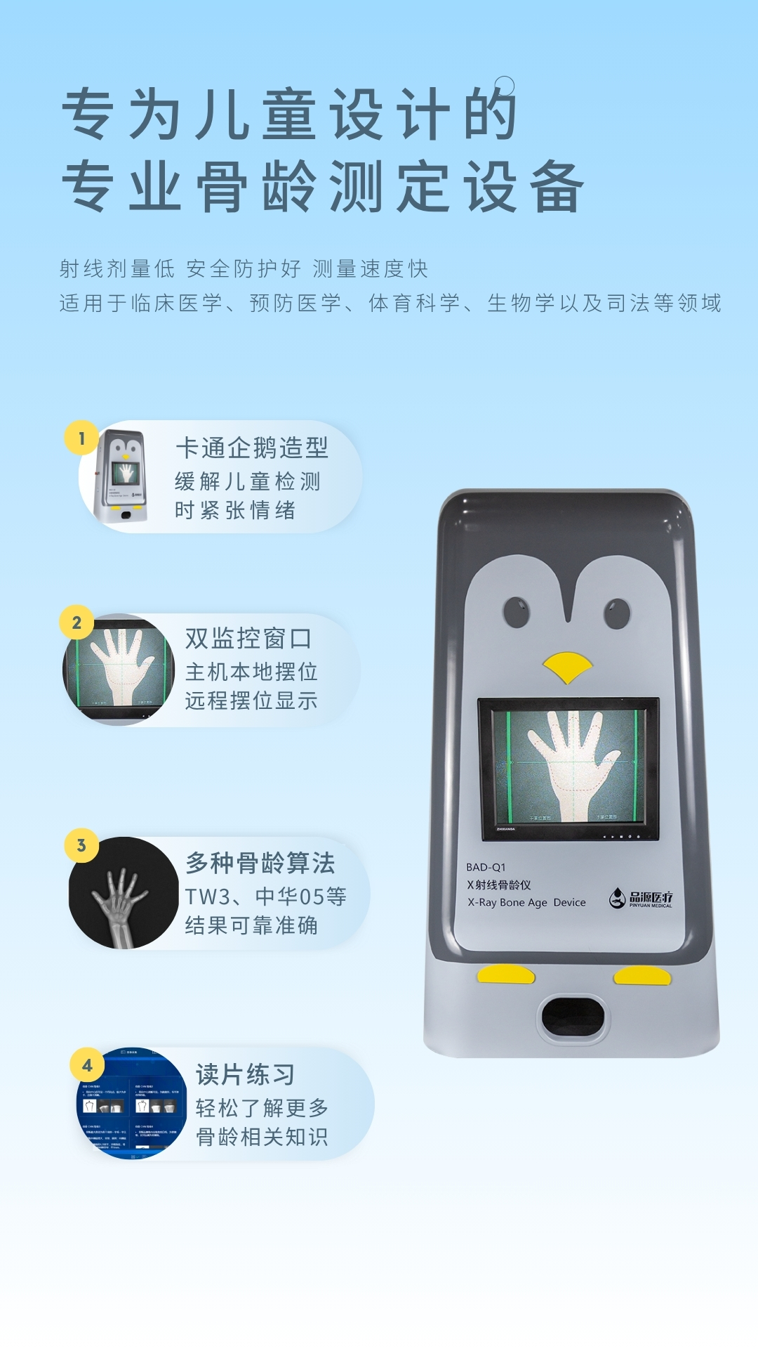 BAD-Q1型X射線骨齡儀產品適用兒童醫院、婦幼保健院、各級醫院的兒保科,體育研究機構,體育學校等,用于對青少年骨齡檢測與體格發育評價。