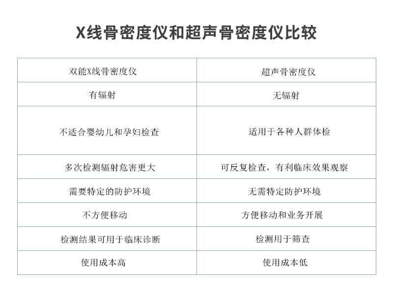 ■ 目前用于臨床的骨密度測量儀器有兩大類,即雙能X線和超聲骨密度測試,雙能X線骨密度儀是行業(yè)檢測標準,準確度高,但從安全性方面超聲骨密度儀有明顯優(yōu)勢,這對人們?nèi)找婷舾械妮椛浔Wo非常重要,比較如下。